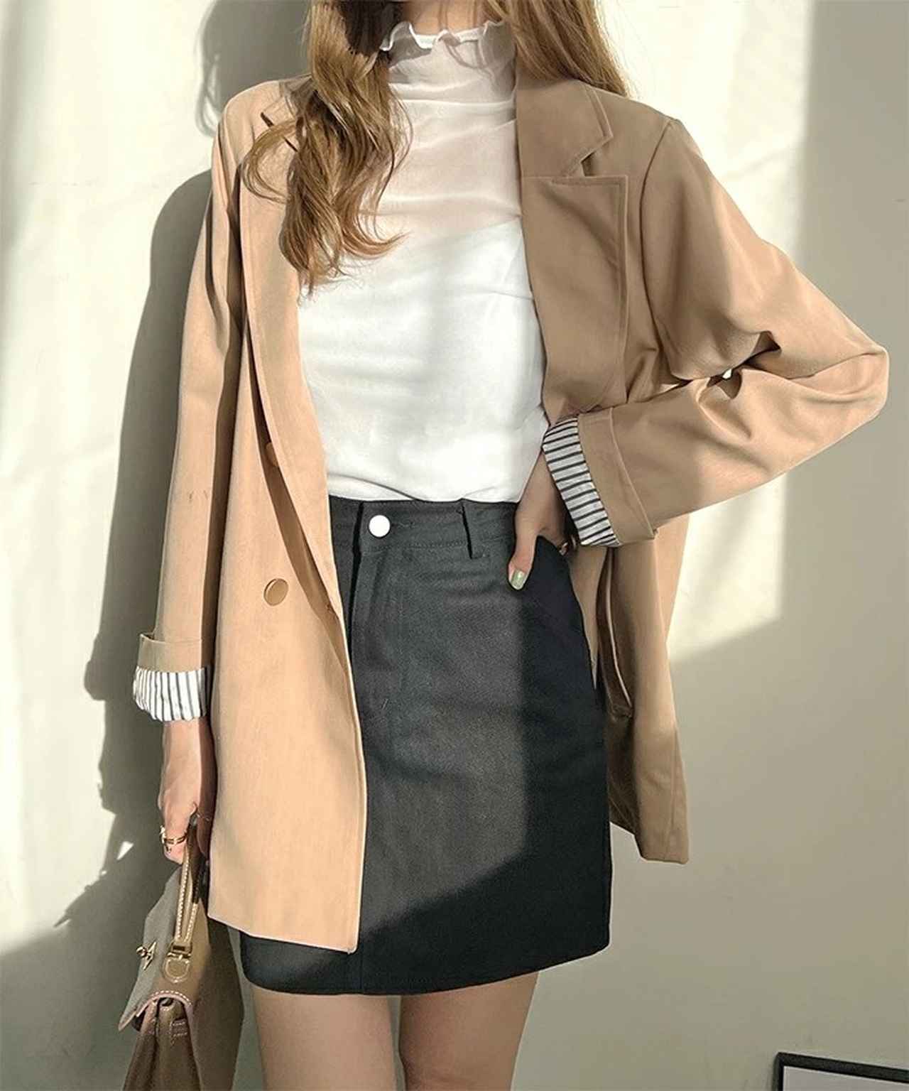 ファッションリーダーも注目している今季のジャケットカラーは、柔らかい雰囲気のベージュ! ソフトで明るい印象も演出できて、カジュアルコーデの着回しにもバッチリです。ブラックのミニスカ&ロングブーツとの組み合わせは失敗ナシの可愛さ♡ このジャケットは袖をまくるとストライプがアクセントになってオシャレです。