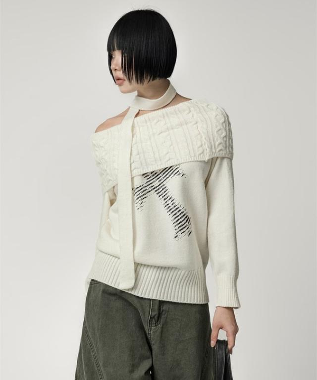 ナローマフラーがセットになったオフショルダーのニットは、胸もとのクロスプリントがモードな雰囲気を漂わせる一枚。デコルテ周りをふんわりと包む立体的なケーブル編みが華やかさを添えてくれます。ボトムスにはバレルレッグのウォッシュドカーゴパンツを合わせて、ヴィンテージライクなグランジスタイルに仕上げています。